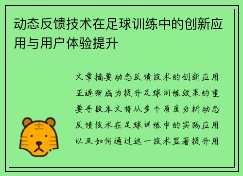 文章摘要:动态反馈技术的创新应用正逐渐成为提升足球训练效果的重要手段。本文将从多个角度分析动态反馈技术在足球训练中的实践应用,以及如何通过这一技术显著提升用户体验。文章首先介绍了动态反馈技术的基本概念及其在足球训练中的作用,然后从四个方面探讨了该技术在足球训练中的创新应用,包括:通过实时数据反馈提升训练精准度、增强互动性和参与感、提升运动员自我评估与调整能力、以及通过个性化反馈促进个体化训练。此外...